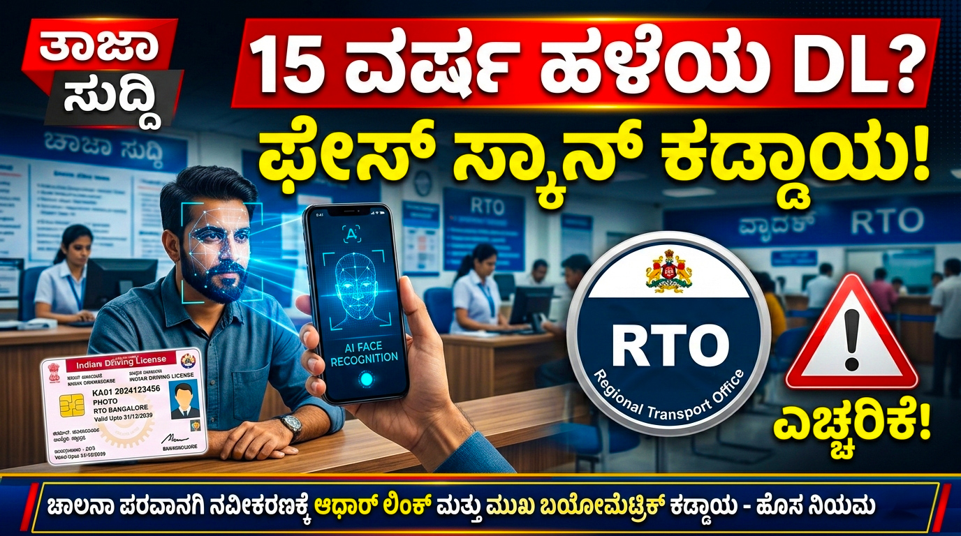 15 ವರ್ಷ ಹಳೆಯ Driving Licence ಇದೆಯಾ? ಫೇಸ್ ಸ್ಕ್ಯಾನ್ ಕಡ್ಡಾಯ! ಹೊಸ DL ನಿಯಮಗಳು 2026 ಸಂಪೂರ್ಣ ಮಾಹಿತಿ