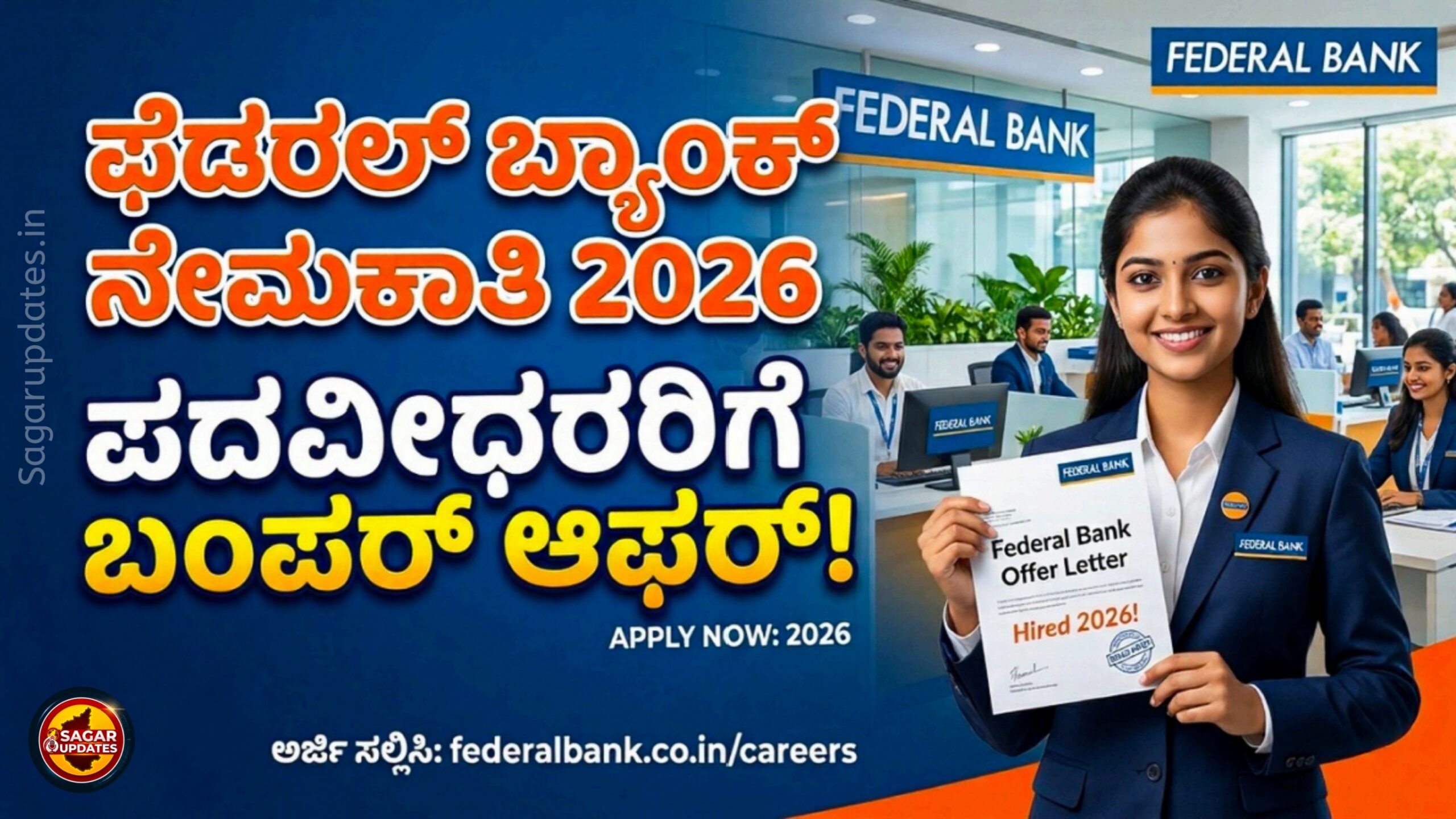 ಹಲೋ ಸ್ನೇಹಿತರೇ ನಮಸ್ಕಾರ, Sagarupdates.in ಗೆ ಸ್ವಾಗತ! ನೀವು ಪದವಿ ಮುಗಿಸಿ ಬ್ಯಾಂಕಿಂಗ್ ಕ್ಷೇತ್ರದಲ್ಲಿ ಅತ್ಯುತ್ತಮ ವೃತ್ತಿಜೀವನವನ್ನು (Banking Career) ರೂಪಿಸಿಕೊಳ್ಳಲು ಕಾಯುತ್ತಿದ್ದೀರಾ? ಹಾಗಿದ್ದರೆ ನಿಮಗೊಂದು ಸುವರ್ಣ ಅವಕಾಶ ಒಲಿದು ಬಂದಿದೆ. ಭಾರತದ ಪ್ರಮುಖ ಮತ್ತು ಪ್ರತಿಷ್ಠಿತ ಖಾಸಗಿ ವಲಯದ ಬ್ಯಾಂಕ್ಗಳಲ್ಲಿ ಒಂದಾದ ಫೆಡರಲ್ ಬ್ಯಾಂಕ್ (Federal Bank) 2026ನೇ ಸಾಲಿನ ಬೃಹತ್ ನೇಮಕಾತಿ ಪ್ರಕ್ರಿಯೆಯನ್ನು ಆರಂಭಿಸಿದೆ.