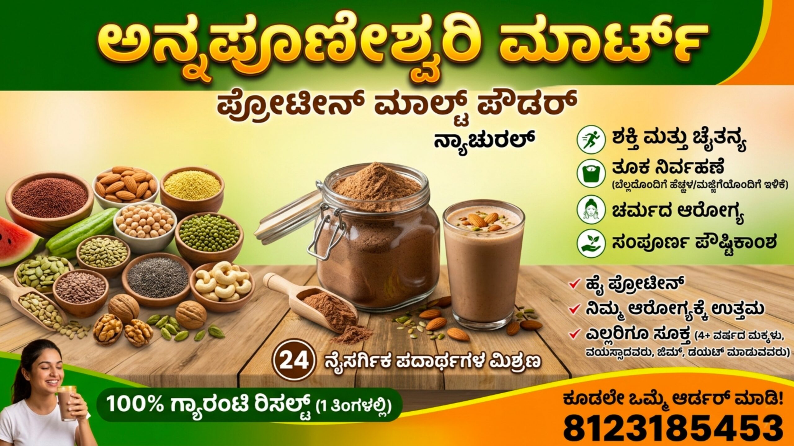 ಆರೋಗ್ಯವೇ ಭಾಗ್ಯ. ನಮ್ಮ ದೇಹಕ್ಕೆ ಬೇಕಾದ ಸರಿಯಾದ ಪೋಷಕಾಂಶಗಳನ್ನು ನ್ಯಾಚುರಲ್ ಆಗಿ ಒದಗಿಸಿದರೆ, ತೂಕದ ಸಮಸ್ಯೆ, ಸ್ಕಿನ್ ಸಮಸ್ಯೆ, ಮತ್ತು ಸುಸ್ತು ಎಲ್ಲವೂ ದೂರವಾಗುತ್ತದೆ. ‘ಅನ್ನಪೂರ್ಣೇಶ್ವರಿ ಮಾಲ್ಟ್’ ಕೇವಲ ಒಂದು ಪ್ರಾಡಕ್ಟ್ ಅಲ್ಲ, ಇದು ಆರೋಗ್ಯಕರ ಜೀವನಶೈಲಿಗೆ ಒಂದು ಅತ್ಯುತ್ತಮ ಹೆಜ್ಜೆ.