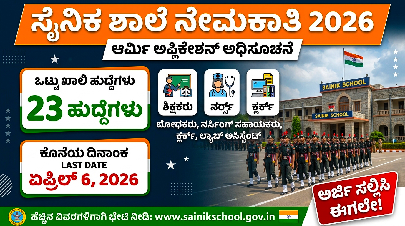 🎯 Sainik School Recruitment 2026: ಶಿಕ್ಷಕರಿಗೆ ಭರ್ಜರಿ ಅವಕಾಶ – 23 ಹುದ್ದೆಗಳ ಭರ್ತಿ!