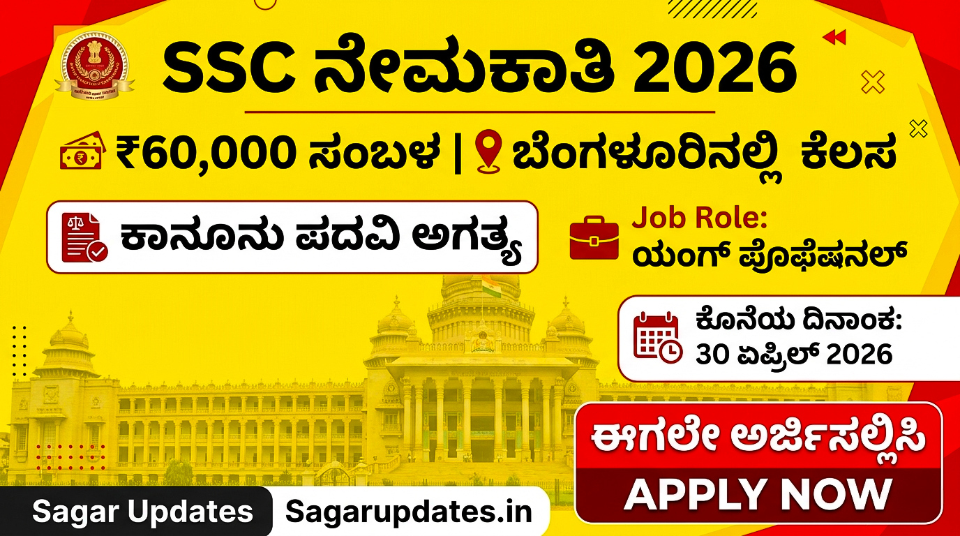 • SSC Recruitment 2026: ಬೆಂಗಳೂರಿನಲ್ಲೇ ಕೇಂದ್ರ ಸರ್ಕಾರಿ ಕೆಲಸ! ತಿಂಗಳಿಗೆ ₹60,000 ಸಂಬಳ, ಯಾವುದೇ ಪರೀಕ್ಷೆ ಇಲ್ಲದೆ ನೇರ ನೇಮಕಾತಿ.